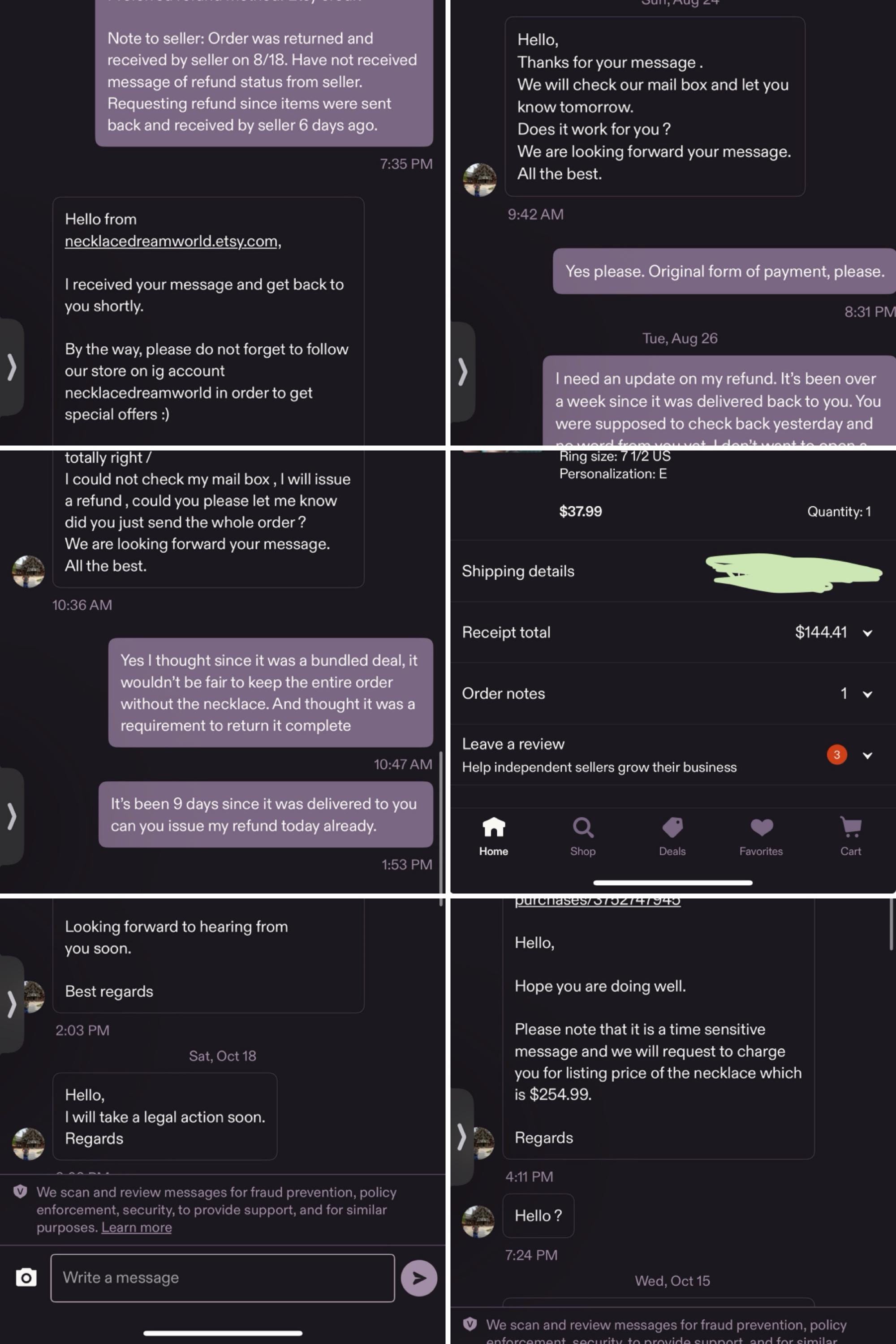 BEWARE. I had not wanted to write a review because I returned the items but I feel compelled to warn buyers from this seller. I returned a bundled deal (necklace, earrings & ring) because the necklace was too yellow (it was supposed to be solid 8kt gold and looked plated). This was back in August, items were returned on 8/18, refund issued 8/27 after asking several times if they checked their mailbox for the return. This seller has been harassing me since 10/14 stating that the necklace was not received (the most expensive piece) and requesting I pay her $254.99 or will take legal action. I paid $144.41 for all 3 items. I contacted Etsy support & reported the seller harassing and threatening me and they stated this is not tolerated and will be monitoring the sellers actions. I will be posting this review on all 3 items returned.